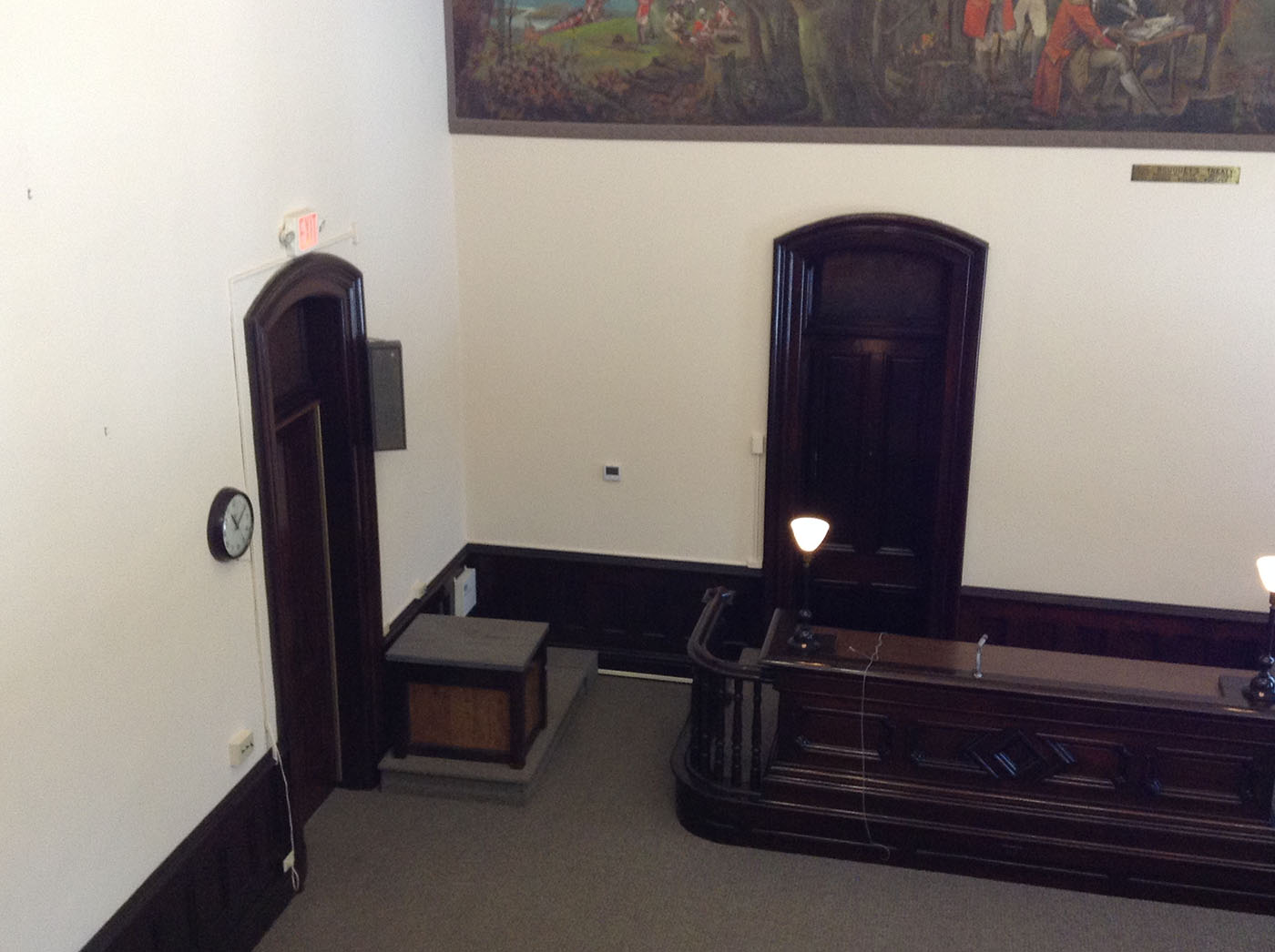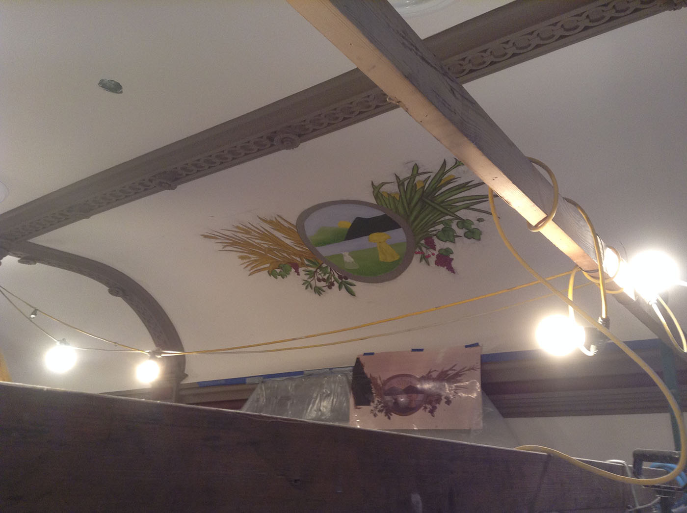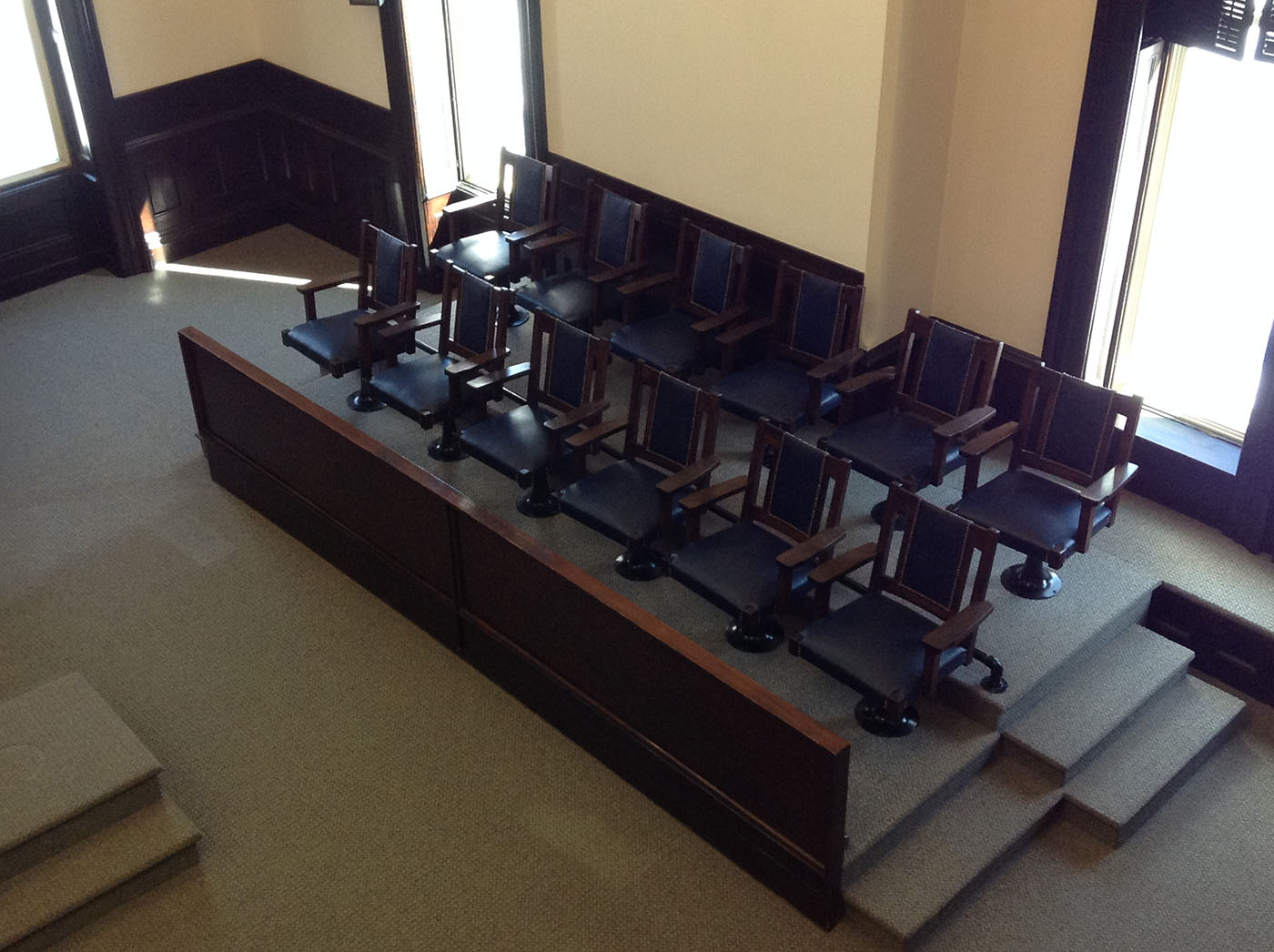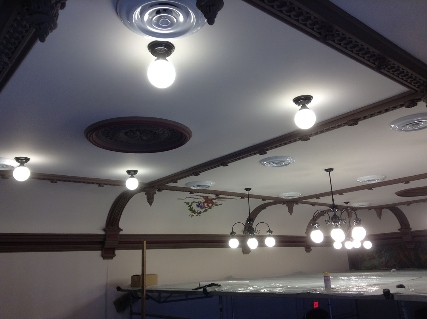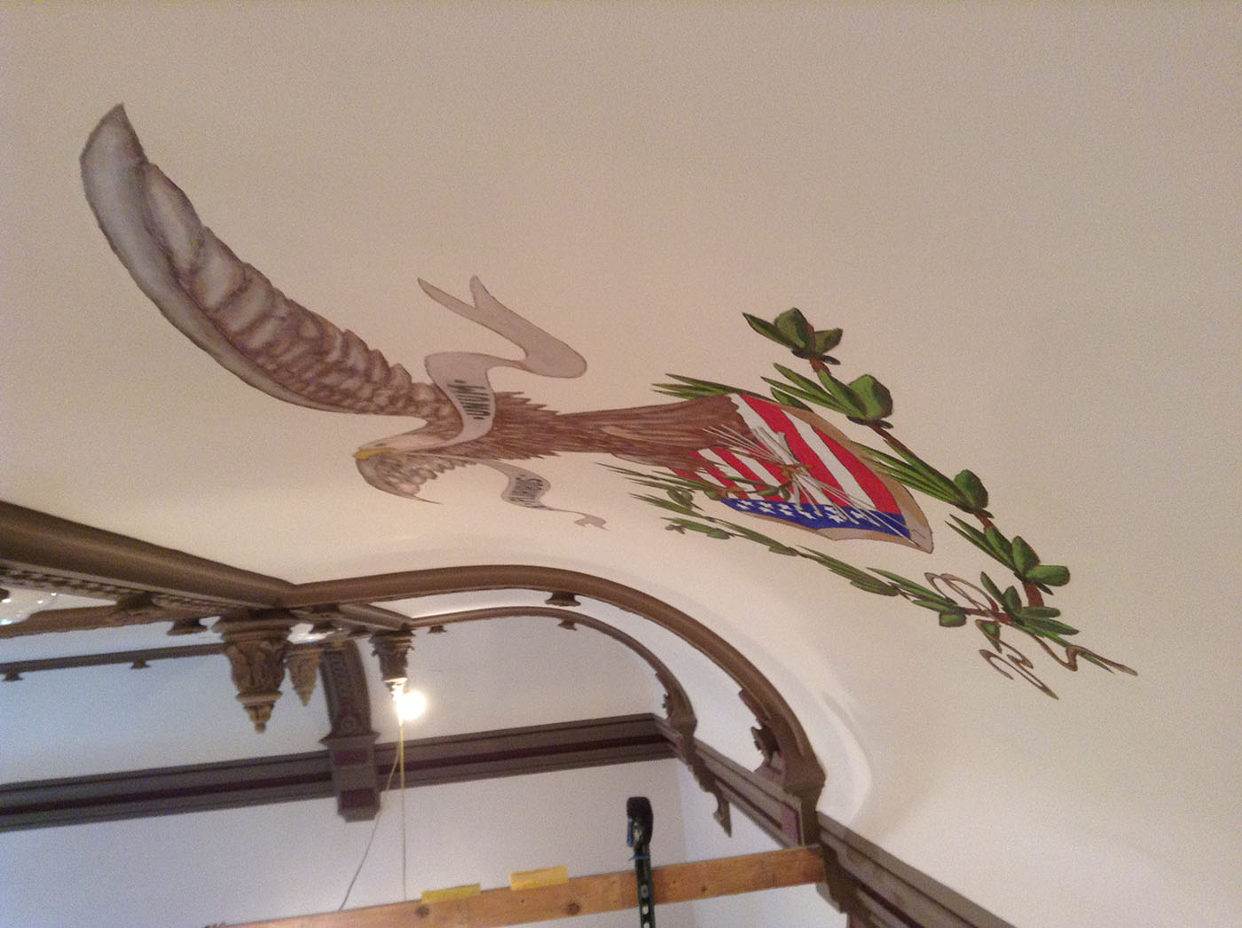 Lepi Enterprises was contracted by Coshocton County to complete courthouse renovations. This phase of the renovations focused on Judge Robert Batchelor's courtroom. The work included removing the dropped ceiling to reveal and restore the original ceiling, which featured three small murals depicting the Coshocton seal, the federal emblem and the Great Seal of Ohio. It also upgraded lighting and reopened and restored the balcony, which had been closed since about 1950, Miller said. For years, the walled-off balcony provided storage space for the court recorder, she said, but now could be available for more gallery space, if the judge so decides. In the courthouse's early days, men watched proceedings from the balcony, which then featured spittoons, while women shopped, Miller said. The biggest "hiccup" in this phase of the restoration came when workers discovered the plaster beneath the uncovered murals was beyond repair, according to Bailiff Barry Ackerman. That required Zanesville artist Alan Cottrell to recreate the murals on drywall. The courtroom restoration began Dec. 3 and was completed by its April 1 deadline, Miller said. Lepi Enterprises of Zanesville oversaw the work.